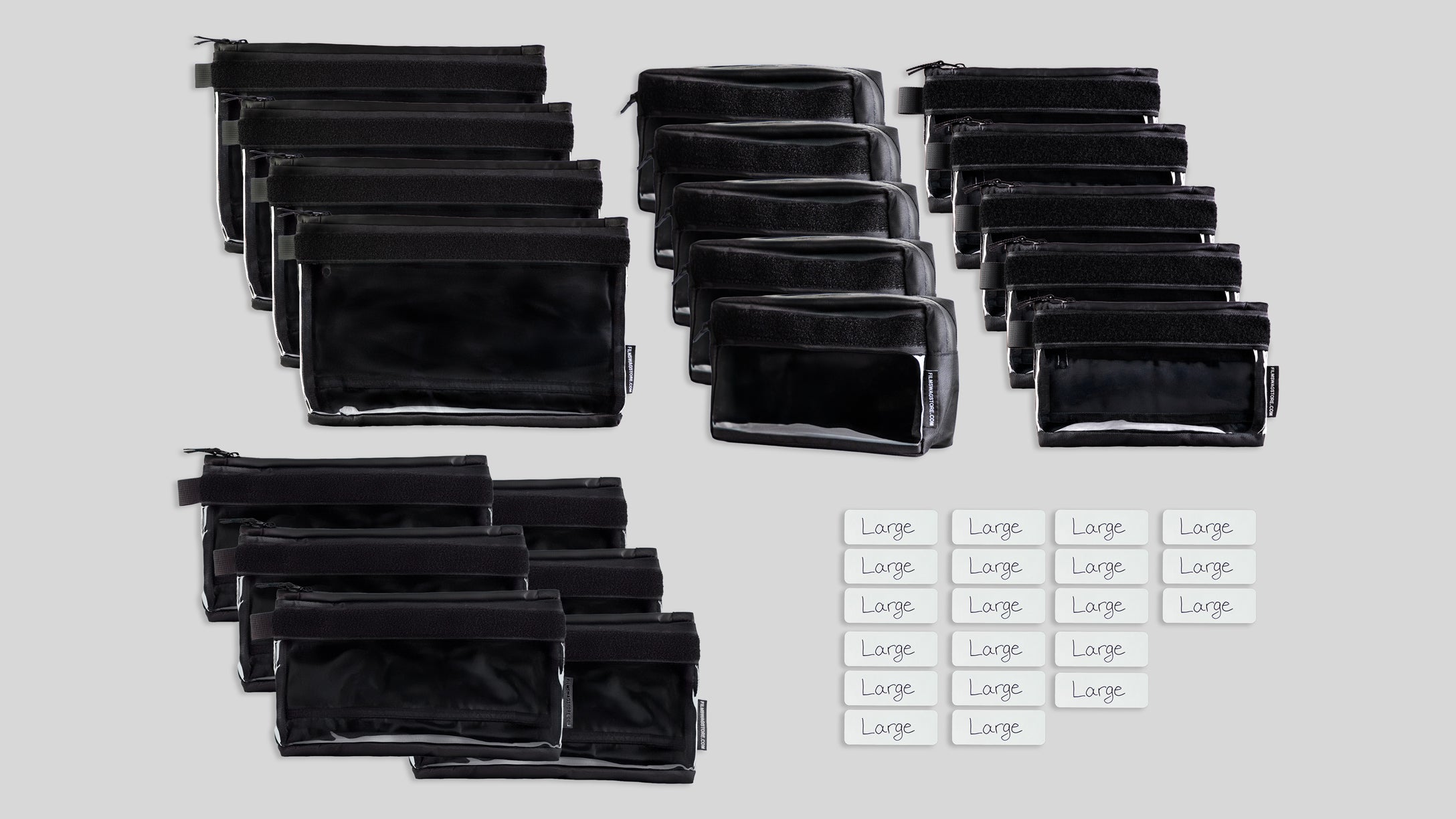 Begin your journey to organized gear with our ultimate package deal. Included in this package are 5 small, 5 Large Pocket Smalls, 6 Medium, 4 Large Organizer and 20 whiteboard tags.